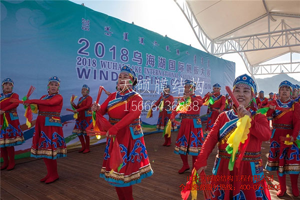 本次比賽場地膜結構看臺工程由山東天碩膜結構工程有限公司承建,本膜結構看臺樣式經過眾設計師的設計方案,層層篩選最后選定本方案,本方案的設計靈感源自哈達。藏、蒙古等民族人士頂禮佛像、拜見尊長、迎來送往、致敬致賀、婚喪嫁娶等禮儀活動中,均有獻哈達的習慣。由此,敬獻哈達表示人們對佛的敬仰,對迎見之人的敬意與祝福。